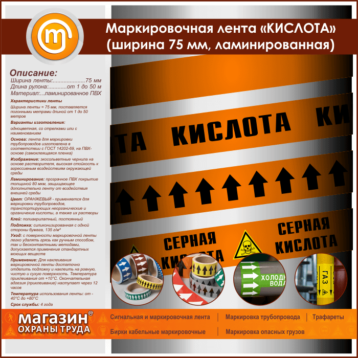 Маркировочная лента «КИСЛОТА» (ширина 75 мм, самоклеящаяся плёнка) в Южно-Сахалинске купить