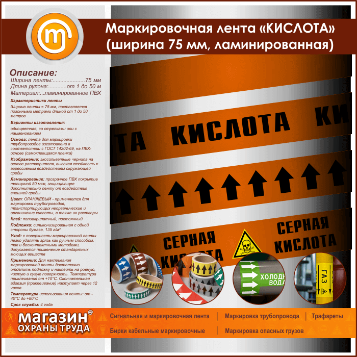 Маркировочная лента «КИСЛОТА» (ширина 75 мм, самоклеящаяся плёнка с ламинированием) в Южно-Сахалинске купить