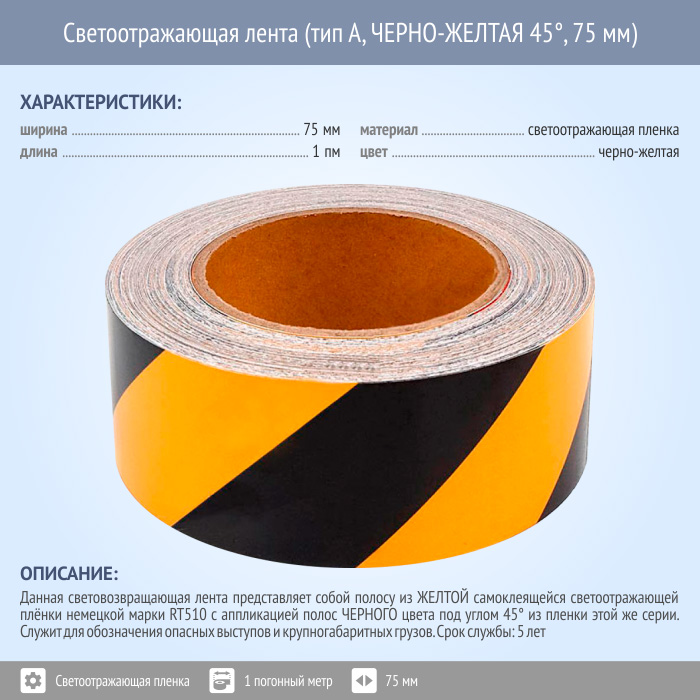 Светоотражающая сигнальная лента (тип А, ЧЕРНО-ЖЕЛТАЯ 45°, 75 мм х 1 п.м.) в Южно-Сахалинске купить